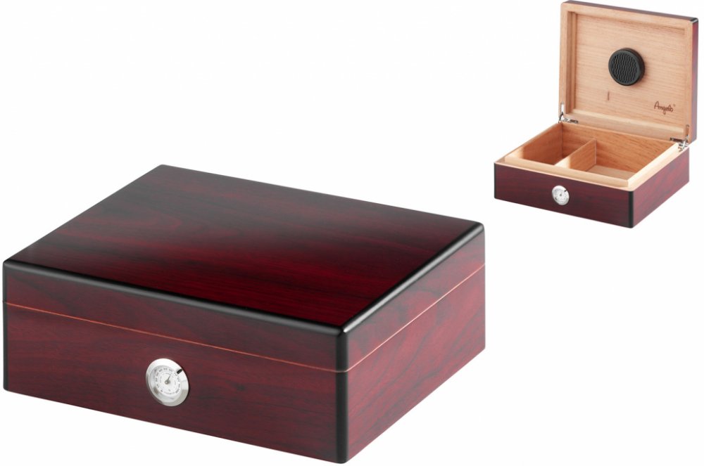 Humidor na doutníky Angelo v klasickém stolním provedení a v elegantním červenohnědém lakování s jemně zaoblenými hranami je vyrobený z kvalitního cedrového dřeva. Vlhkoměr a zvlhčovač je součástí humidoru.
