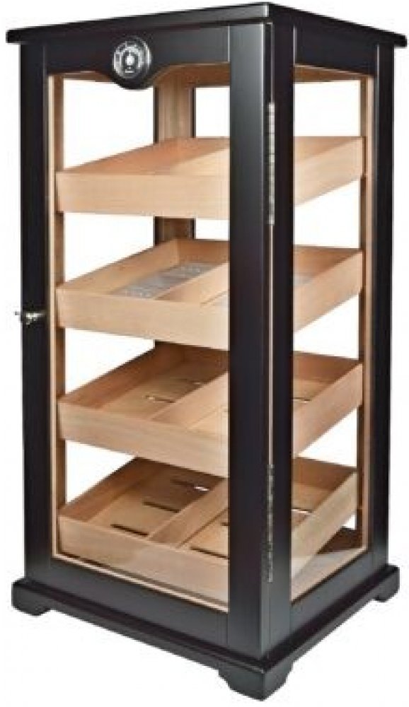 Stolní humidor na doutníky Cabinet Gastro s kapacitou cca 150 doutníků (v závislosti na velikosti). Uzamykatelný humidor v černé barvě má povrch v matném provedení. Dvířka a ostatní stěny humidoru jsou prosklená tvrzeným plexisklem. Díky zámku se dvěma klíči je tento humidor také vhodný pro použití v gastro provozech nebo kuřáckých klubech. Prostor pro doutníky tvoří čtyři cedrové přihrádky, které lze umístit vodorovně nebo šikmo. Každá přihrádka je vybavená stavitelnou přepážkou. Doutníky je možné skladovat po jednotlivém kuse nebo také po celém balení. Humidor je vybavený vyměnitelným analogovým vlhkoměrem a dvěma polymerovými zvlhčovači, které se umístí do prostoru v humidoru pomocí přiloženého magnetu s oboustrannou lepící páskou. Vnitřek humidoru je vyložený cedrovým dřevem, které prospívá skladování doutníků. Poškrábání povrchu na kterém je humidor postavený, zabraňují plstěné podložky, kterými je vybavená spodní část humidoru.Celkové rozměry humidoru (Š x H x V): 330 x 290 x 690 mmProstor pro doutníky - rozměry přihrádky vnitřní (Š x H x V): 257 x 216 x 33 mmPrůměr otvoru pro vložení vlhkoměru: 45 mmRozměry zvlhčovače (Š x H x V): 165 x 64 x 17 mm