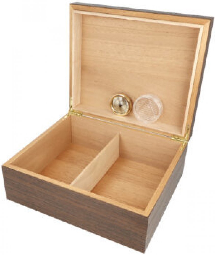 Stolní humidor na doutníky Ořech s kapacitou cca na 25 doutníků (v závislosti na velikosti). Atraktivní humidor je ve tmavě hnědém tónu s výraznější kresbou. Polomatný povrch humidoru je efektně jemně drážkovaný. Prostor pro doutníky je možné rozdělit dle potřeby přiloženou přepážkou. Humidor je vybavený vyměnitelným analogový vlhkoměrem a polymerovým zvlhčovačem, které uchytíte v humidoru pomocí přiložených samolepících pásků se suchým zipem. Vnitřek humidoru je vyložený cedrovým dřevem, které prospívá skladování doutníků. Poškrábání povrchu, na kterém je humidor položený, zabraňuje jemná sametová látka, kterou je spodní vnější část humidoru vybavena.