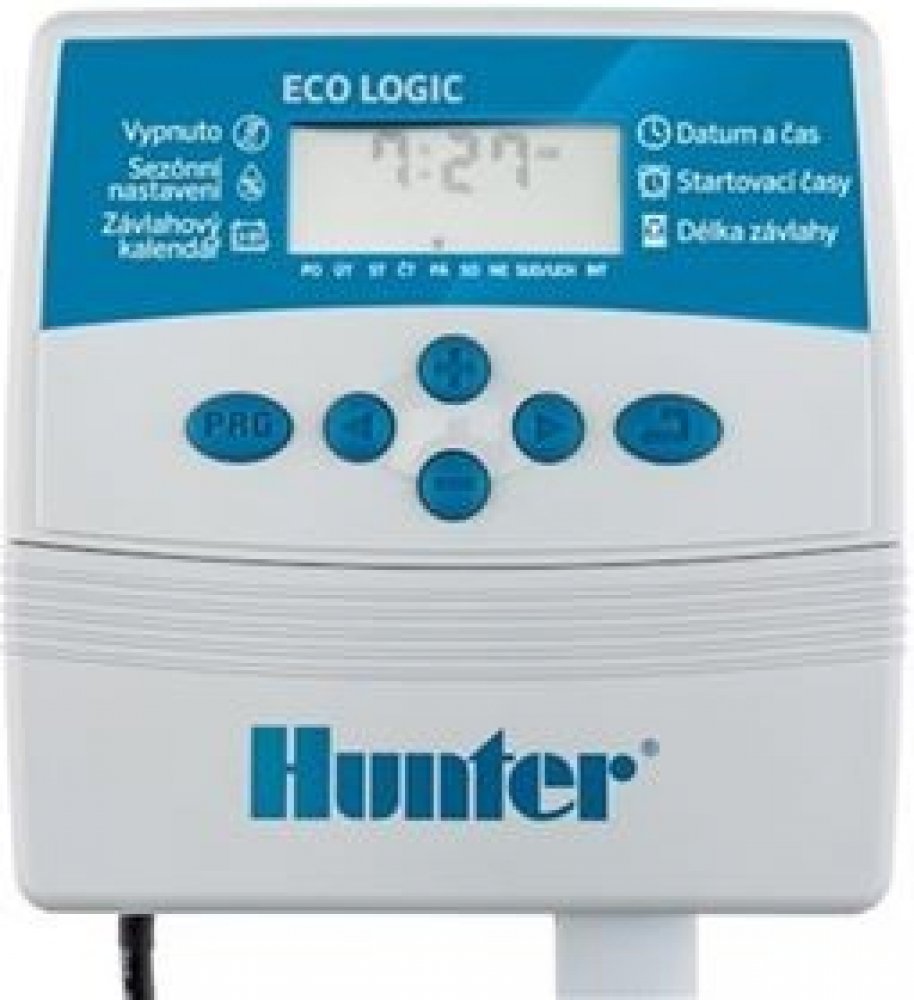 Řídící jednotka Hunter ELC 601i-E pro 6 sekcíHunter ELC 601i-E je spolehlivá interiérová řídicí jednotka určená pro automatické zavlažování menších a středně velkých zahrad. Nabízí ovládání až 6 sekcí a je ideální pro zavlažovací systémy rodinných domů, menších trávníků či záhonů.Jednotka umožňuje snadné a přehledné programování pomocí až 3 nezávislých programů s možností nastavení čtyř startovacích časů v každém z nich. Zavlažovací kalendář nabízí režim týdenního plánování, sudé/liché dny i intervalový režim až na 31 dnů.Součástí jsou funkce jako programovatelná dešťová pauza, manuální spuštění, testovací režim a paměť Easy Retrieve. Díky možnosti připojení dešťového senzoru nebo půdního čidla dokáže jednotka reagovat na aktuální klimatické podmínky. Napájení je zajištěno externím transformátorem (součást balení), zálohování při výpadku proudu obstará 9V baterie.Klíčové vlastnosti 6 sekcí Ideální pro menší zavlažovací systémy v domácích zahradách a menších veřejných plochách Až 3 programy a 4 starty na každý program Flexibilní plánování závlahy podle potřeby jednotlivých sekcí Délka závlahy až 4 hodiny Vhodné i pro delší cykly nebo pomalejší kapkovou závlahu Zavlažovací kalendář podle dnů nebo intervalu 7denní režim, sudé/liché dny, nebo interval 1–31 dní Kompatibilita se senzory Možnost připojení dešťového senzoru Rain Clik nebo půdního čidla Soil Clik Funkce dešťové pauzy Možnost přerušit závlahu na 1 až 7 dní bez zásahu do programování Pevné napájení 230V/24V Externí transformátor je součástí balení, záložní baterie 9V při výpadku prouduPaměť Easy RetrieveFunkce Easy Retrieve slouží jako ruční záloha celého naprogramování jednotky. Umožňuje uložit kompletní konfiguraci závlahového plánu do paměti a kdykoliv ji jednoduše obnovit. Hodí se při sezonních změnách, po zásahu technika nebo pro návrat k výchozímu nastavení bez nutnosti vše znovu programovat.QuickCheckFunkce QuickCheck umožňuje rychlou kontrolu kabeláže v terénu stiskem jediného tlačítka. Pokud je na některé sekci zjištěn zkrat, jednotka okamžitě zobrazí chybové hlášení ERR.
