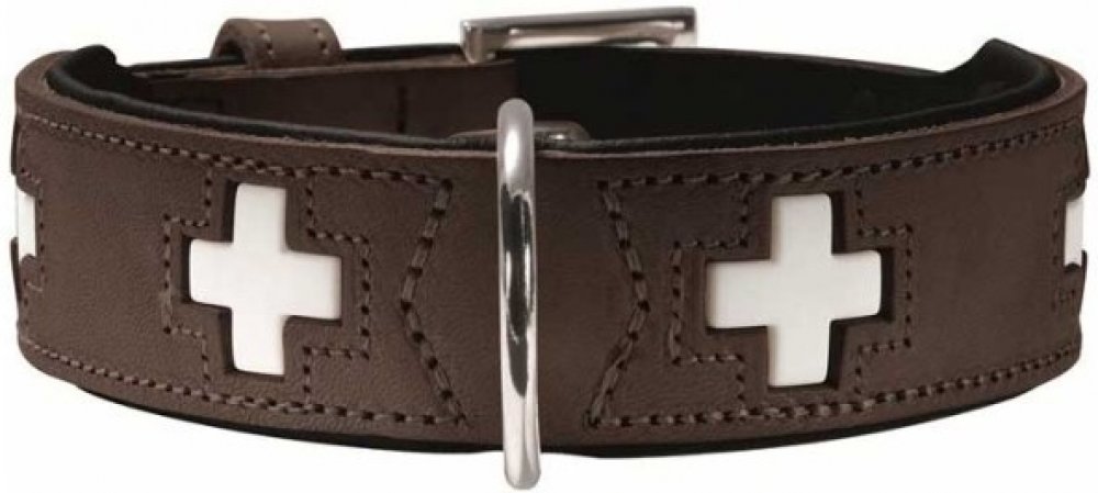 Obojek Swiss je zdoben, dle svého jména, švýcarskými křížky, vkládanými mezi vrstvy kůže. Kovové části jsou poniklované. Dostupný je ve čtyřech odstínech a mnoha velikostech, aby mohl zdobit velké i malé psy. I použité pigmenty a zušlechťující prostředky jsou EKO a zaručují, že je kůže jemná a brilantně se leskne na povrchu. Pro mimořádný komfort je Swiss lemován jemnou hovězí usní a má všitý kroužek pro uchycení vodítka.