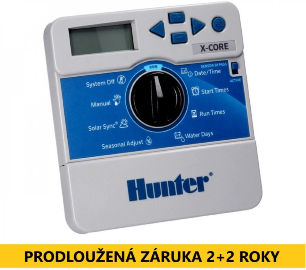 Řídící jednotka HUNTER X-CORE 401i E pro automatické řízení závlahového systému s možností napojení senzorů deště a půdního čidlaŘídící jednotka HUNTER HUNTER X-CORE 401i E - 4 sekce - interní je profesionální řídící jednotka pro řízení automatické závlahy. Specifikace a výhody:určená pro instalaci v interiéru (dům, garáž, zahradní domek)možnost ovládání maximálně 4 větev - sekcíjednotka má 3 nezávislé programyv každém programu je možné zvolit 4 startovací časymožnost napojení dešťového senzoru Rain Clik, Solar Sync a půdního čidla Soil Clikzabudovaný senzor Solar Syncmožnost odpojení senzoru pro jednotlivé větve (např. větev pro zavlažování skleníku)programovatelná dešťová pauzatrvalá paměťrychlá kontrola systému pomocí testovacího programupaměť Easy Retrievesystém QuickCheck - umožňuje zjistit problémy s elektroinstalací na místě instalace stiskem jediného tlačítkaautomatická ochrana proti zkratusezónní nastavení - dlouhodobé nebo automatické aktualizace se senzorem Solar Syncpauza mezi sekcemimožnost programování senzorůmožnost ovládání hlavního ventilu nebo relé čerpadlamožnosť pripojiť diaľkové ovládanie ROAM KITBYPASS dešťového senzorudodává se s transformátoremprodloužená záruka 2+2 roky (nevztahuje se na trafo)