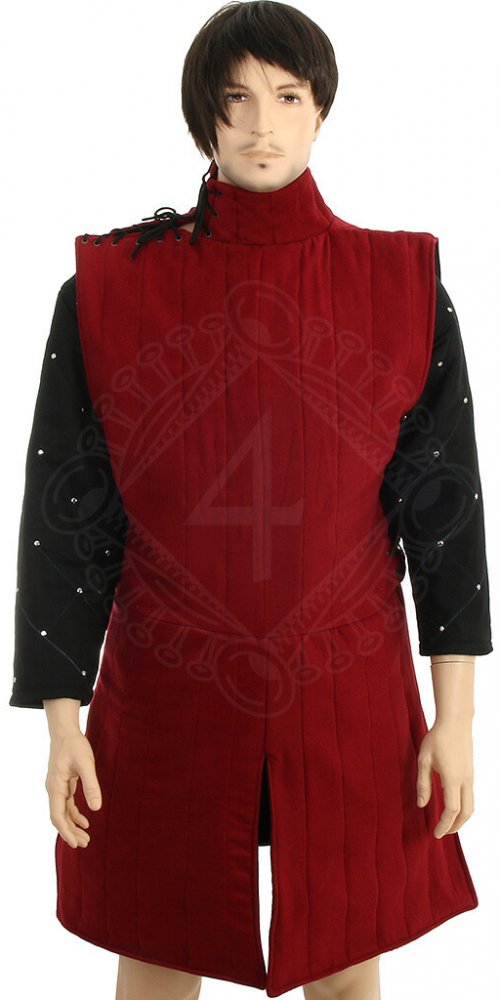 Černý gambeson bez rukávů a vínová prošívanice Žoldák Obsah dodávky: jeden gambeson bez rukávů, prošívanice (prošívaná tunika) nebo obojí dle Vaší volby Materiál: 100% bavlna Gambeson a prošívanice jsou k dostání ve standardních velikostech podle této tabulky. Bez příplatku Vám je zhotovíme přesně na míru. V tom případě po dokončení objednávky vyplňte tuto tabulku rozměrů. Vínově červený gambeson z čisté bavlny má vysoký límec a rozparky po stranách. Lze lel individuálně přizpůsobit velikosti Vaší postavy pomocí postranního šněrování, které sahá od pasu přes rameno až po límec. Gambeson a prošívanice mohou též posloužit jako vycpávka pod zbroj či brnění jako dodatečná ochrana. Tato výstroj žoldáka Vám díky vhodně umístěným rozparkům poskytne pohodlnou hybnost. Na levé straně najdeme šněrování od pasu po límec, které usnadňuje oblékání. Toto je nepostradatelný oděv každého rytíře či žoldnéře!