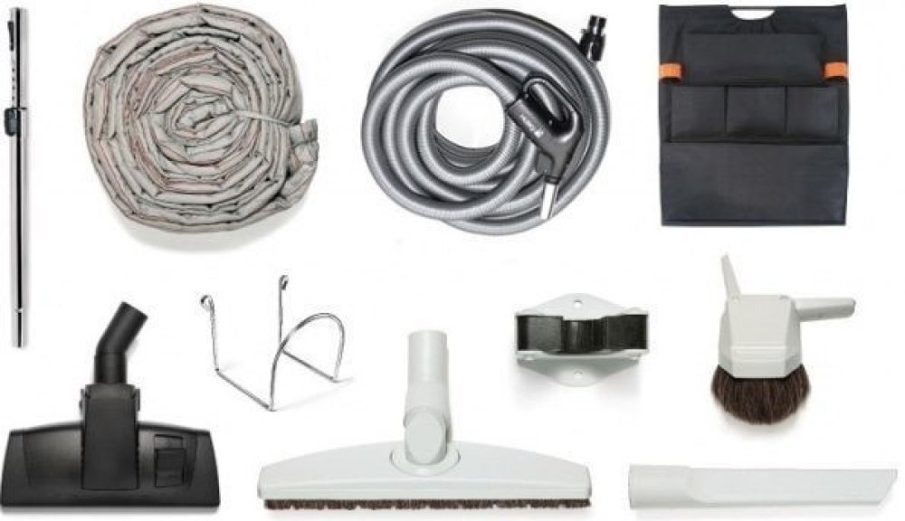 Luxusní sada příslušenství pro centrální vysavače s vysoce odolnou hadicí 9,1m a ergonomickým držadlem s vypínačem. Součástí sady jsou všechny potřebné kvalitní nástavce včetně látkového potahu na hadici, který brání náhodnému poškození interiéru.