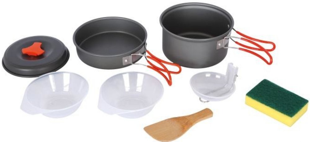 Univerzální set nádobí z hliníku. Obsahuje hrnec, pánev, dvě misky, vařečku, skládací naběračku a houbičku na mytí. Ideální na cesty přírodou, kde je požadována malá hmotnost a skladnost.