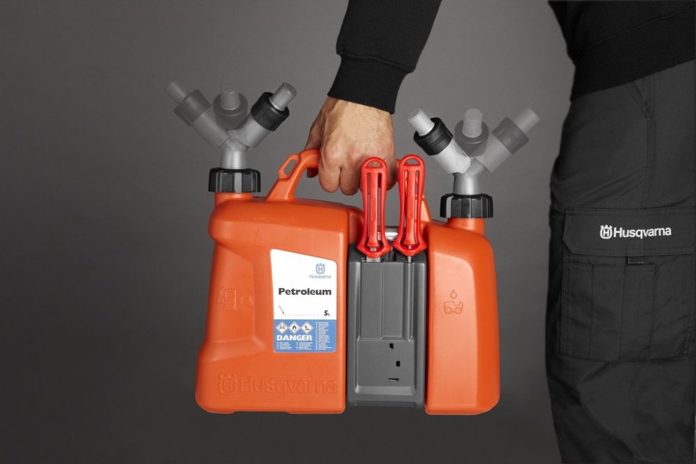 Kanystr kombi Husqvarna 5L/2,5L new je praktickým pomocníkem pro každého majitele motorových zařízení. Díky průhlednému okénku snadno zkontrolujete množství paliva bez nutnosti otevírání kanystru. Součástí je plastová přihrádka na nářadí, kam můžete uložit často používané nástroje nebo řetězy, což usnadňuje práci přímo v terénu. Kanystr je vybaven nalévacím hrdlem určeným pro bezpečné a přesné doplňování oleje i benzínu. Kombinace těchto vlastností z něj činí ideální volbu pro efektivní a organizovanou práci s motorovými stroji.
