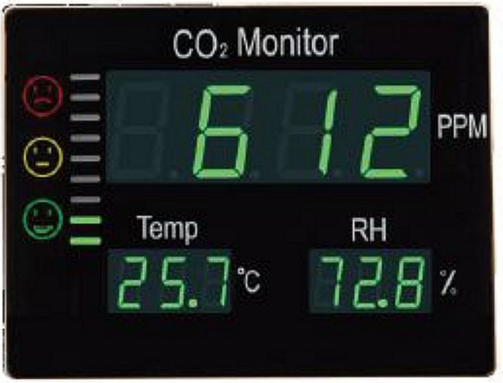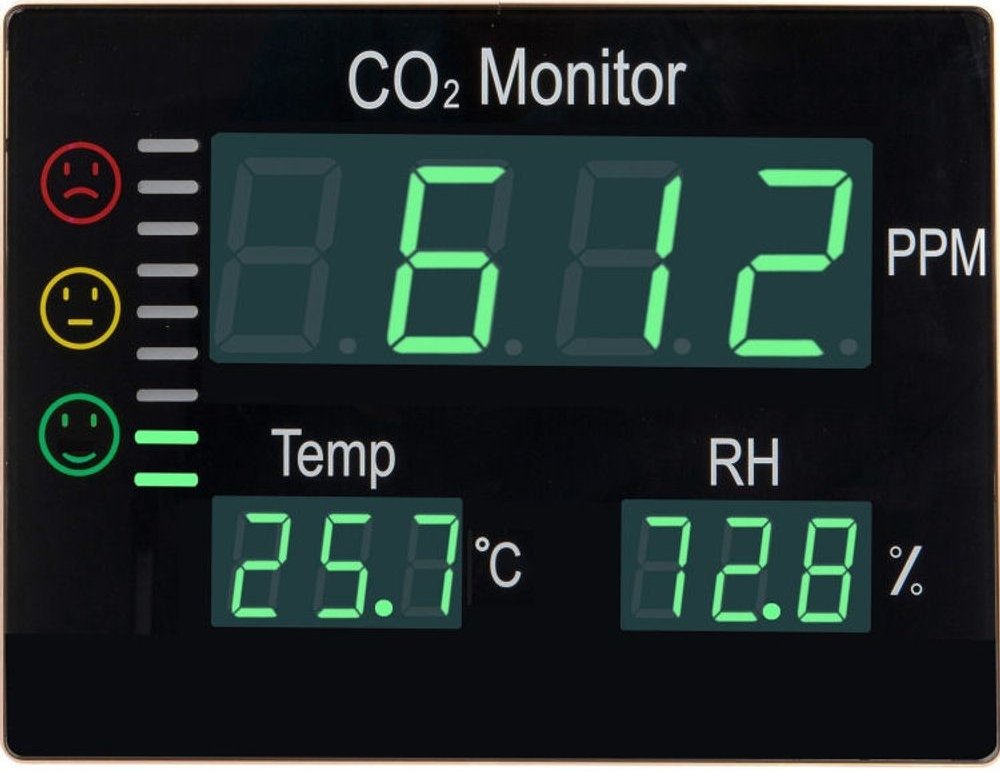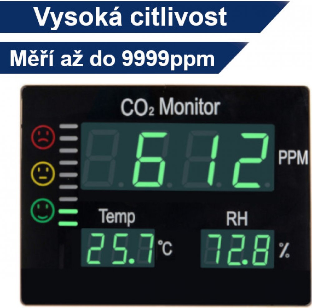 Nástěnný detektor CO2 (oxidu uhličitého - ´vydýchaného vzduchu´), teploty a vlhkosti na velkém LED displeji.