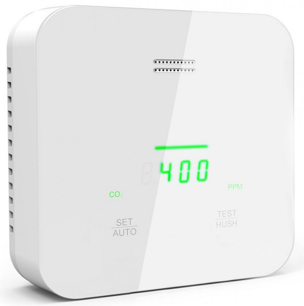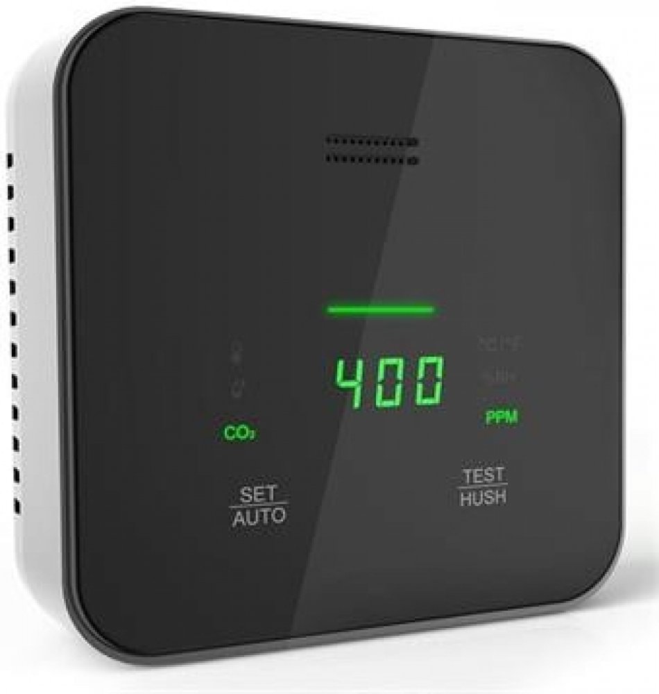 Designový detektor CO2 (monitor 'vydýchaného vzduchu'), svým provedením je vhodný např. do bytu či kanceláře, na LCD displeji zobrazuje úroveň CO2, případně teplotu, nebo vlhkost.