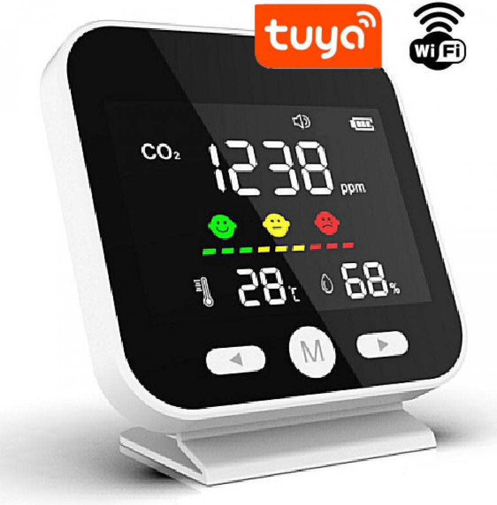 Designový detektor CO2 (monitor ’vydýchaného vzduchu’), svým provedením je vhodný např. do bytu či kanceláře, na LCD displeji zobrazuje úroveň CO2, teplotu, vlhkost.