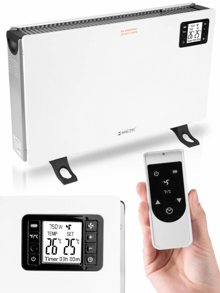 Konvektor je revoluční řešení vytápění , které zvýší teplotu v místnosti několik minut po zapnutí! Slouží k vytápění kanceláří, domů, obchodů, bytů, kanceláří atd. Jeho hlavní předností je termostat , který při jednorázovém nastavení bude udržovat teplotu v místnosti bez dalšího zásahu.NASTAVITELNÝ VÝKON - 750W, 1250W a 2000W - umožňuje přizpůsobit topný výkon vašim aktuálním potřebám.TERMOSTAT - umožňuje přesnou regulaci teploty zajišťující optimální podmínky v místnostiDÁLKOVÉ OVLÁDÁNÍ - usnadňuje ovládání funkcí radiátoru, aniž byste museli vstávatTURBO REŽIM - rychlé vytopení místnostiTIMER - plná kontrola nad dobou provozu ohřívače od 1 do 24 hodin.SAFE - ochrana proti přehřátí a funkce automatického vypnutí v případě potřebyOVLÁDACÍ PANEL - s přehledným LCD displejemDESIGN - elegantní, bílý panel se skvěle hodí do každého interiéruNOŽKY VČETNĚ - ideální pro umístění kdekoli v domě.Technické údaje:Možnost nastavení výkonu 750W - 1250W - 2000WIntegrovaný ventilátorOchrana proti přehřátíTermostatVolně stojící v prostoru340./2.0.2