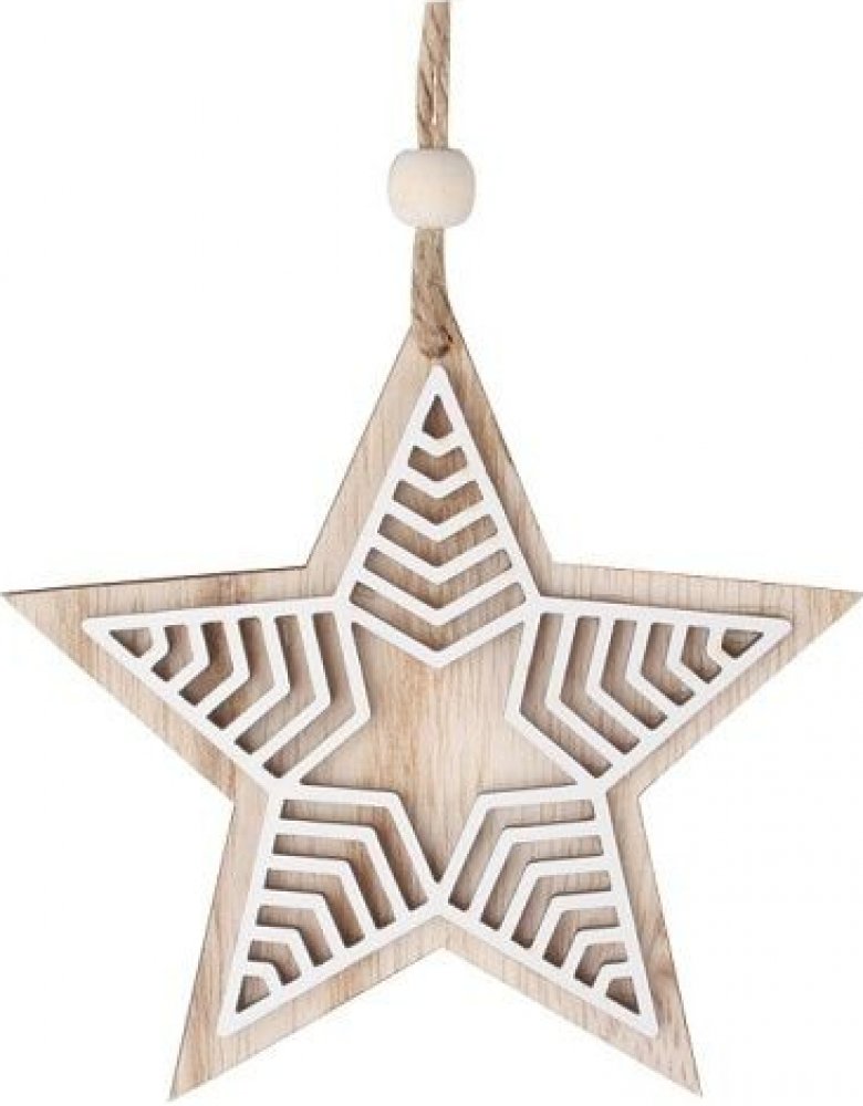 Hvězda s bílým dekorem dřevěná na zavěšení 10 cm