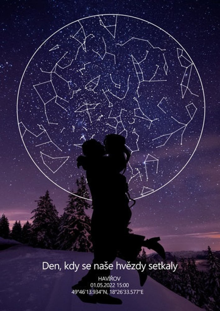 Hvězdná mapa okamžiku pro páry Máte ve Vašem životě okamžik, který byste rádi zvěčnili nebo hledáte dokonalý dárek k výročí? Darujte plakát Hvězdná mapa okamžiku pro páry. Naše partnerská verze hvězdné mapy bude dokonalým dárkem pro Vaši polovičku. Na základě Vašich údajů vytvoříme dokonalou repliku noční oblohy v daný den. Ať už je to Váš první polibek, datum seznámení, zasnoubení nebo výročí. Tvorba hvězdné mapy Pomocí počítačové simulace zobrazíme konstelaci hvězd se stoprocentní přesností. Dokážeme vypočítat rozestavení hvězd v minulosti, současnosti i budoucnosti. A to na jakémkoliv nám uvedete. Proč hvězdná mapa pro páry? Získáte více než pouhou dekoraci. Hvězdná mapa okamžiku bude Vám i Vaší polovičce nadále připomínat šťastné chvíle z Vašeho života. Jedná se o originální romantický dárek, kterým vyjádříte, jak moc si toho druhého vážíte. Materiál a dodání Tiskneme na matný papír používaný v galeriích o gramáži 220gsm. Výhodou matného provedení je absence odlesků v prosvětlené místnosti. Papír je FSC certifikovaný, pochází tedy ze zdrojů, které garantují udržitelné hospodaření s lesy. Mapy bez rámu zasíláme v pevných kartonových obálkách/krabicích/tubusech. Pokud si přejete zaslat plakát v tubusu kvůli obdarování, uveďte nám to prosím do poznámky. V případě zakoupení s rámem je rovnou zkompletujeme. Vy tak dostáváte mapu připravenou rovnou k obdarování. Produkty standardně odesíláme do Produkty odesíláme do 1-3 pracovních dnů dle vytíženosti.