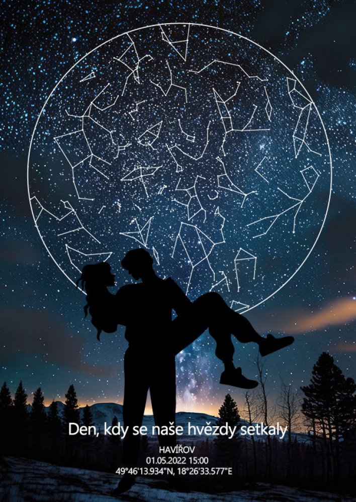 Hvězdná mapa okamžiku pro páry Máte ve Vašem životě okamžik, který byste rádi zvěčnili nebo hledáte dokonalý dárek k výročí? Darujte plakát Hvězdná mapa okamžiku pro páry. Naše partnerská verze hvězdné mapy bude dokonalým dárkem pro Vaši polovičku. Na základě Vašich údajů vytvoříme dokonalou repliku noční oblohy v daný den. Ať už je to Váš první polibek, datum seznámení, zasnoubení nebo výročí. Tvorba hvězdné mapy Pomocí počítačové simulace zobrazíme konstelaci hvězd se stoprocentní přesností. Dokážeme vypočítat rozestavení hvězd v minulosti, současnosti i budoucnosti. A to na jakémkoliv nám uvedete. Proč hvězdná mapa pro páry? Získáte více než pouhou dekoraci. Hvězdná mapa okamžiku bude Vám i Vaší polovičce nadále připomínat šťastné chvíle z Vašeho života. Jedná se o originální romantický dárek, kterým vyjádříte, jak moc si toho druhého vážíte. Materiál a dodání Tiskneme na matný papír používaný v galeriích o gramáži 220gsm. Výhodou matného provedení je absence odlesků v prosvětlené místnosti. Papír je FSC certifikovaný, pochází tedy ze zdrojů, které garantují udržitelné hospodaření s lesy. Mapy bez rámu zasíláme v pevných kartonových obálkách/krabicích/tubusech. Pokud si přejete zaslat plakát v tubusu kvůli obdarování, uveďte nám to prosím do poznámky. V případě zakoupení s rámem je rovnou zkompletujeme. Vy tak dostáváte mapu připravenou rovnou k obdarování. Produkty standardně odesíláme do Produkty odesíláme do 1-3 pracovních dnů dle vytíženosti.