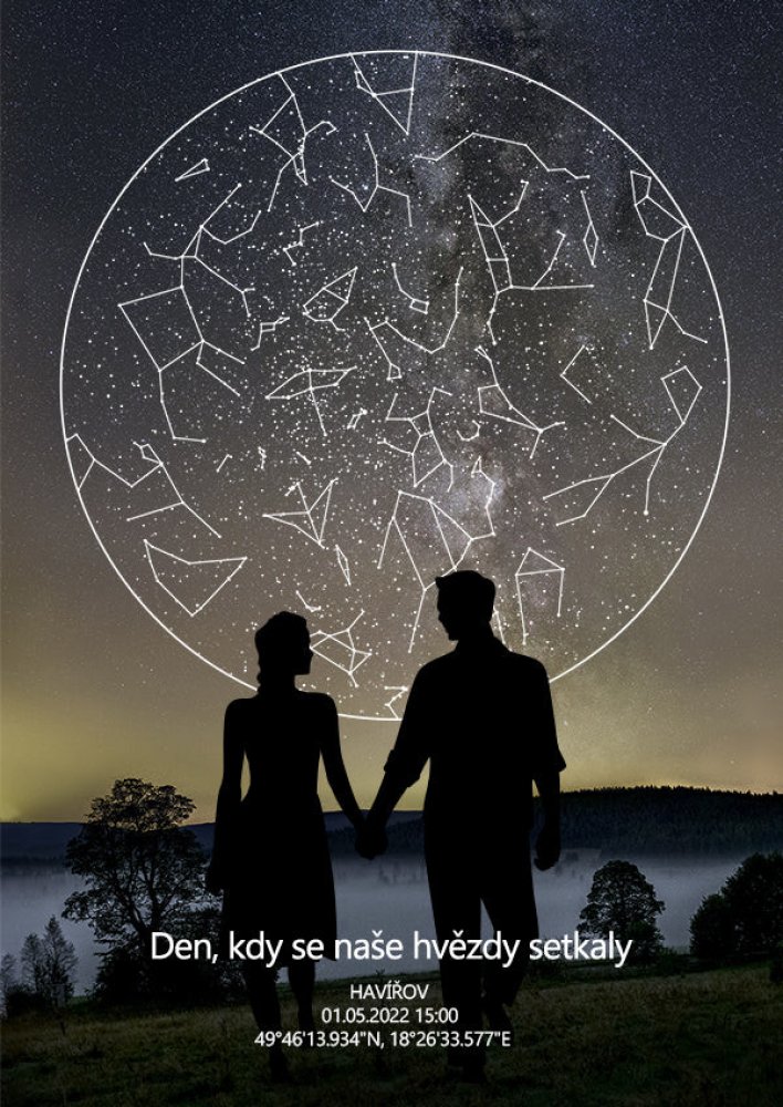 Hvězdná mapa okamžiku pro páry Máte ve Vašem životě okamžik, který byste rádi zvěčnili nebo hledáte dokonalý dárek k výročí? Darujte plakát Hvězdná mapa okamžiku pro páry. Naše partnerská verze hvězdné mapy bude dokonalým dárkem pro Vaši polovičku. Na základě Vašich údajů vytvoříme dokonalou repliku noční oblohy v daný den. Ať už je to Váš první polibek, datum seznámení, zasnoubení nebo výročí. Tvorba hvězdné mapy Pomocí počítačové simulace zobrazíme konstelaci hvězd se stoprocentní přesností. Dokážeme vypočítat rozestavení hvězd v minulosti, současnosti i budoucnosti. A to na jakémkoliv nám uvedete. Proč hvězdná mapa pro páry? Získáte více než pouhou dekoraci. Hvězdná mapa okamžiku bude Vám i Vaší polovičce nadále připomínat šťastné chvíle z Vašeho života. Jedná se o originální romantický dárek, kterým vyjádříte, jak moc si toho druhého vážíte. Materiál a dodání Tiskneme na matný papír používaný v galeriích o gramáži 220gsm. Výhodou matného provedení je absence odlesků v prosvětlené místnosti. Papír je FSC certifikovaný, pochází tedy ze zdrojů, které garantují udržitelné hospodaření s lesy. Mapy bez rámu zasíláme v pevných kartonových obálkách/krabicích/tubusech. Pokud si přejete zaslat plakát v tubusu kvůli obdarování, uveďte nám to prosím do poznámky. V případě zakoupení s rámem je rovnou zkompletujeme. Vy tak dostáváte mapu připravenou rovnou k obdarování. Produkty standardně odesíláme do Produkty odesíláme do 1-3 pracovních dnů dle vytíženosti.