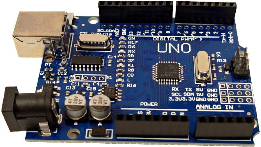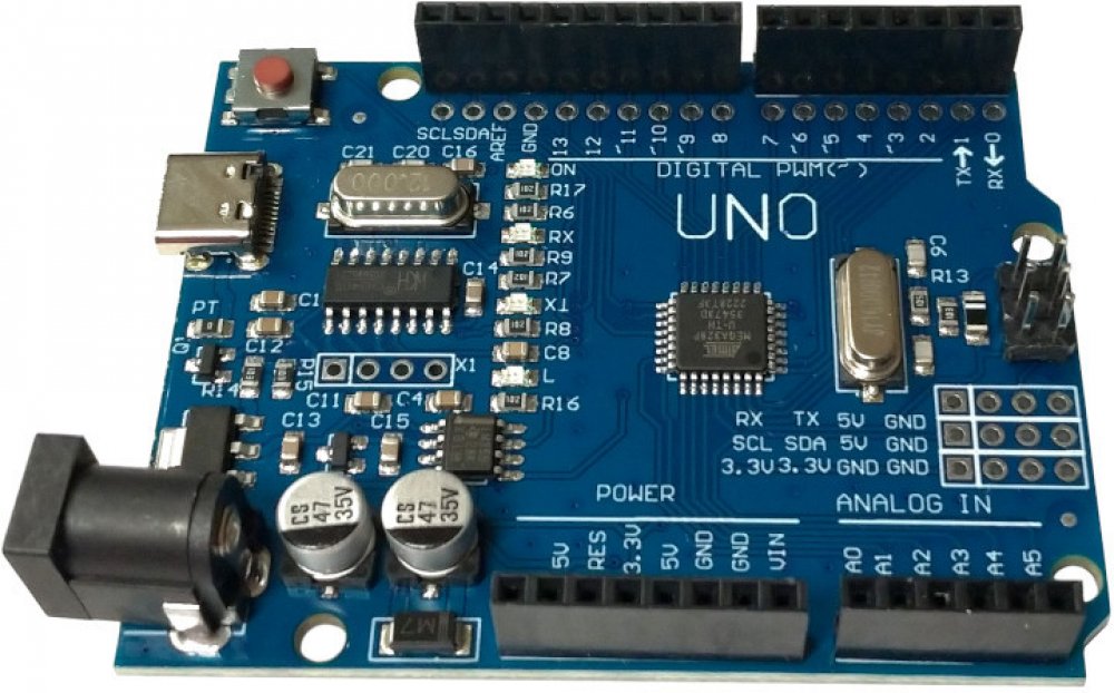 Arduino Uno je nejběžněji používaná deska s mikrokontrolérem Atmega328. Jedná se o klon základní verze, ze které ostatní verze desek více či méně vychází. Uno obsahuje 14 digitálních vstupů/výstupů a 8 analogových. Konektor k připojení externího napájení a rovněž je na desce připojena jedna LED dioda, kterou lze ovládat.