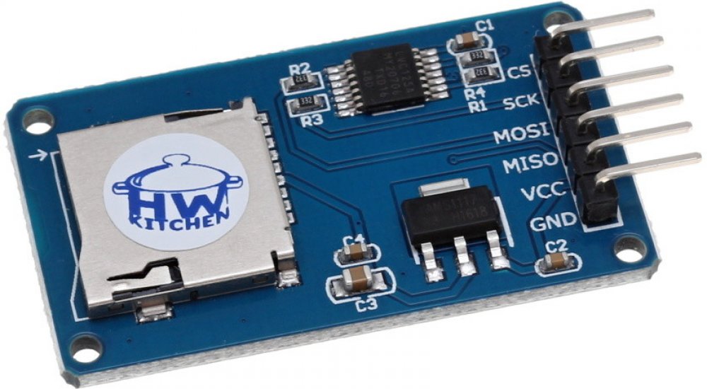 Elektronický modul je určen pro Micro SD a SDHC karty a k Arduino desce se připojuje pomocí 6 pinů (GND, VCC, MISO, MOSI, SCK, CS). Piny MISO, MOSI, SCK představují komunikační rozhraní SPI mezi Arduinem a modulem, CS je signál pro výběr obvodu. Modul je vybaven montážními otvory pro snadné uchycení například blízko předního panelu. Vložení a vyjmutí paměťové karty je snadné.