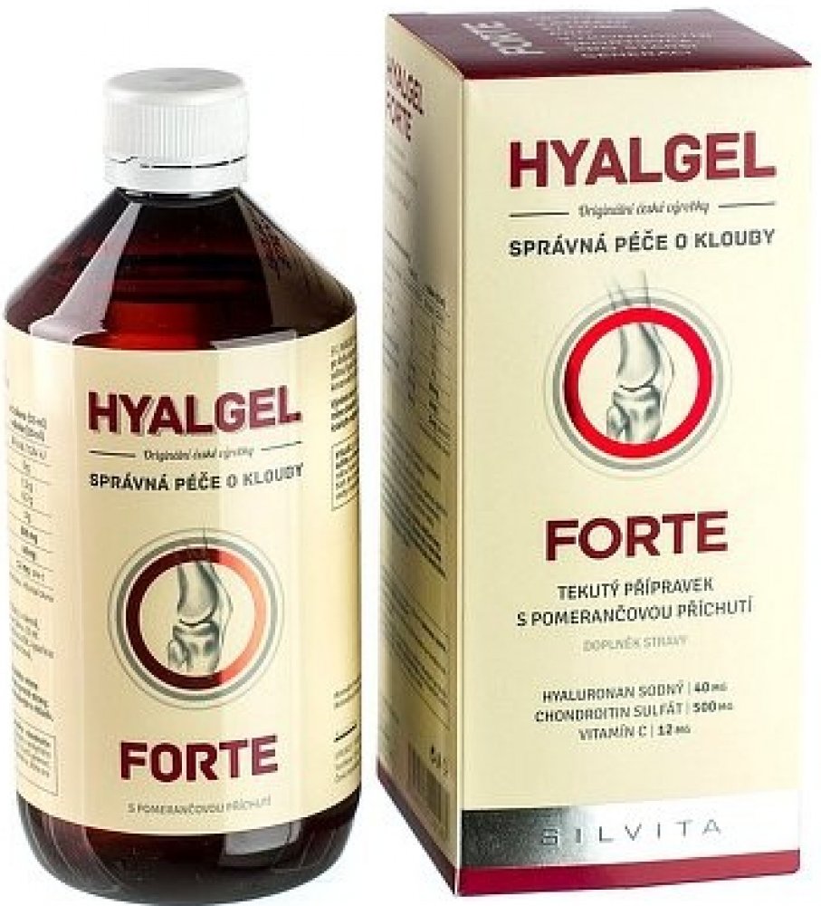 Doplněk stravy - kloubní výživa v tekuté formě s obsahem hyaluronanu sodného, chondroitin sulfátu a vitamínu C. HYALGEL FORTE kloubní výživa v tekuté formě s obsahem hyaluronanu sodného, chondroitin sulfátu a vitamínu C.