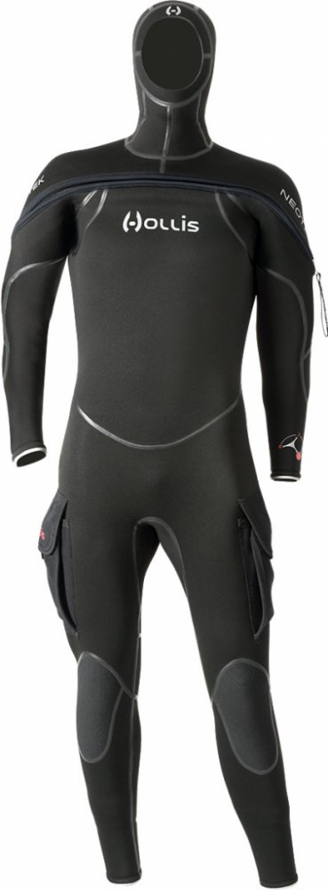 Nový oblek Hollis Neotek poskytuje výborný tepelný komfort zejména díky kombinaci neoprenů různých tlouštěk 8/7/6mm ve spojení s přiléhavou integrovanou kuklou. U obleku Neotek byl použit neopren odolný proti kompresi a doplněn o vnitřní vrstvu ThermaSkin, která zvyšuje výhřevnost obleku. Různá tloušťka panelů byla použita s ohledem na perfektní zateplení konkrétních částí těla a zároveň výtečnou pohyblivost v obleku. Neotek je vybaven netradičním, ale důmyslným předním horizontálním zipem G-Lock pro snadné oblékání bez cizí pomoci. Zip je pohodlný, vyrobený z moderních plastů, opatřený kovovým jezdcem a táhlem pro snadnou manipulaci. Speciální vnitřní neoprenový límec výrazně eliminuje vniknutí vody. Zápěstí a kotníky jsou utěsněny funkčními skrytými manžetami, které znáte u vyšších řad obleků BARE, např. Velocity. Rukávy a nohavice jsou navíc ukončeny měkkými manžetami. Velmi pevná konstrukce švů je tvořena prošitím elastickou nití, dvojitým lepením a navíc ještě použitím technologie tekutého švu liquid seam.