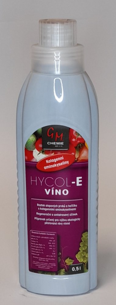 Rozsah a způsob použití: Hycol-Evíno je kapalný přípravek vyvinutý speciálně pro foliární výživu ekologicky pěstované révy vinné. Složení a poměr stopových prvků, draslíku a hořčíku bylo navrženo na základě rozboru půdy, listů a hroznů na vybraných moravských vinicích. Účinnou složkou jsou vodorozpustné přírodní oligopeptidy, aminokyseliny, stopové prvky, draslík a hořčík. Přípravek příznivě ovlivňuje řadu biochemických reakcí rostlin, podporuje jejich růst, vývoj a tvorbu reprodukčních orgánů. Zlepšuje adaptabilitu rostlin ve stresových situacích, velmi vhodná je aplikace při poškození porostů. Nenahrazuje základní hnojení. Používá se ve formě 0,5% roztoku (50?ml Hycol-Evíno do 10?l vody v postřikovači). Vhodná je opakovaná aplikace během vegetace po 3 týdnech. Aplikaci provádějte v ranních a večerních hodinách. Naředěný přípravek spotřebujte do 3 dnů. Aplikační nádoby po práci dobře propláchněte vodou. Doporučená jednorázová dávka hnojiva je 5 l/ha, doba první aplikace závisí na velikosti listové plochy a intenzitě růstu. Obecně asi od poloviny června. Poslední aplikaci provádějte do konce srpna.