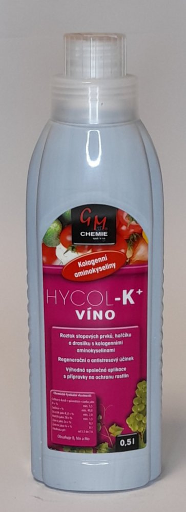 Rozsah a způsob použití: Hycol K+ Víno je kapalný přípravek vyvinutý speciálně pro foliární výživu révy vinné. Složení a poměr stopových prvků, draslíku a hořčíku bylo navrženo na základě rozboru půdy, listů a hroznů na vybraných moravských vinicích. Účinnou složkou jsou vodorozpustné přírodní oligopeptidy, aminokyseliny, stopové prvky, draslík a hořčík. Přípravek příznivě ovlivňuje řadu biochemických reakcí rostlin, podporuje jejich růst, vývoj a tvorbu reprodukčních orgánů. Zlepšuje adaptabilitu rostlin ve stresových situacích, velmi vhodná je aplikace při poškození porostů. Má vlastnosti přírodního smáčedla. Nenahrazuje základní hnojení. Používá se ve formě 0,5% roztoku (50ml Hycol K+víno do 10?l vody v postřikovači). Vhodná je opakovaná aplikace během vegetace po 3 týdnech. Výhodná je společná aplikace s přípravky na ochranu rostlin - nejlépe s fungicidy. Aplikaci provádějte v ranních a večerních hodinách. Naředěný přípravek spotřebujte do 3 dnů. Aplikační nádoby po práci dobře propláchněte vodou. Doporučená jednorázová dávka hnojiva je 5 l/ha, doba první aplikace závisí na velikosti listové plochy a intenzitě růstu. Obecně asi od poloviny června. Poslední aplikaci provádějte do konce srpna.