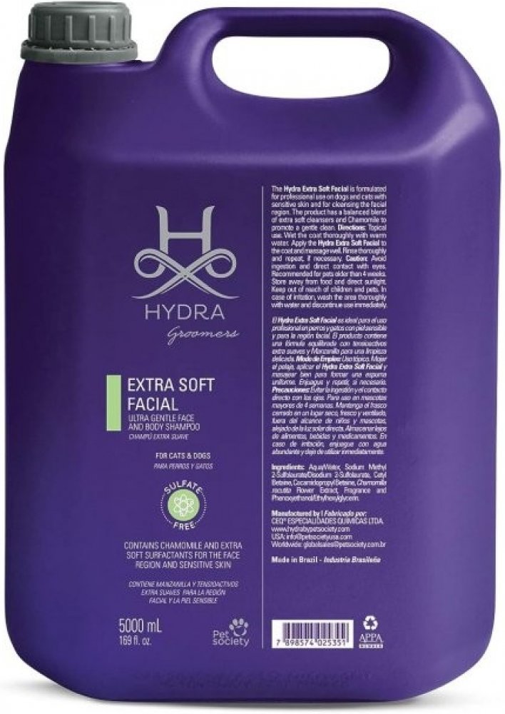 Hydra Extra jemný a ultra šetrný šampon je speciálně vyvinutý pro profesionální použití u psů a koček s citlivou pokožkou. Tento zklidňující šampon je dostatečně jemný pro použití na obličej, zatímco jeho vyvážená směs extra jemných čisticích látek a heřmánku hydratuje srst, udržuje vlhkost a chrání přirozené oleje v kůži. Tento šampon je zcela bez sulfátů pro snížení rizika podráždění a jeho vůně je 100% hypoalergenní. Jedná se o profesionální výrobek navržený groomery pro groomery a je k dispozici v objemu 1 l.