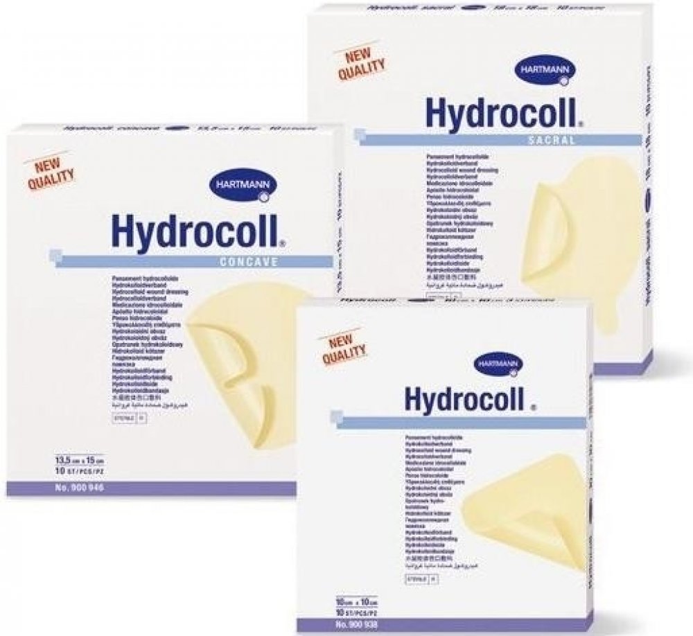 Hydrocoll je určen pro mírně nebo středně exsudující povrchové rány v granulační nebo epitelizační fázi. Speciální provedení sacral a concave je určeno pro ošetřování dekubitů v sakrální oblasti a na patách, loktech a kolenou.