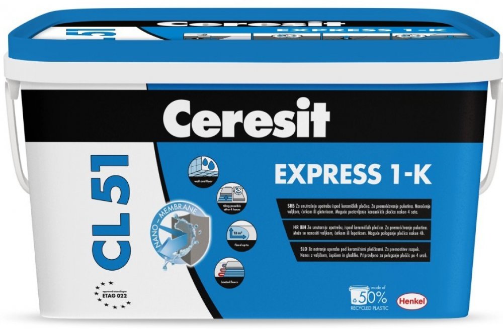 Jednosložková elastická hydroizolace Ceresit CL 51 je určena k povrchovému bezešvému utěsnění podkladů před lepením obkladů a dlažeb keramických, gresových (nenasákavých) i z kameniny. Na místech zatížených vlhkostí, jako jsou koupelny, kuchyně, toalety, sprchy a prádelny. Materiál je přímo připravený ke zpracování. Hydroizolace Ceresit CL 51 splňuje nároky pro izolace lehkého typu. Pro izolaci podlah ve sprchových koutech se zapuštěným odtokovým žlabem doporučujeme použít hydroizolaci Ceresit CL 50. Technické parametry: - Báze: modifikovaná disperze umělé pryskyřice - Barva: šedá - Hustota 1,55 +/- 5 % kg/dm3 - Konzistence: pasta - Teplota pro zpracování: od + 5 °C do + 25 °C - Doba schnutí první vrstvy: cca 1,5 hod - Doba schnutí druhé vrstvy: cca 2 h - Lepení obkladů: po cca 4 h od nanesení druhé vrstvy - Tahová přídržnost (dle normy ČSN-EN 14891:2009) počáteční / po kontaktu s vodou / po tepelném stárnutí / po cyklickém zmrazování - rozmrazování / po kontaktu s vápennou vodou: více nebo rovno 0,5 MPa - Vodotěsnost pod tlakem 0,15 MPa po 7 dnech (dle normy ČSN-EN 14891:2009): nepropustný - Schopnost přemostění trhliny (dle normy ČSN 14891:2009): více nebo rovno 0,75 mm - Orientační spotřeba (dvě vrstvy): cca 1,1 kg/m2