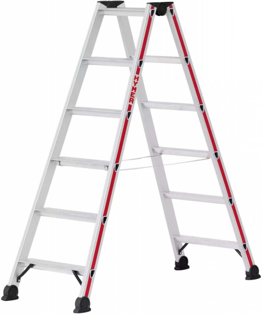Hliníkové štafle Hymer s nášlapy širokými 80 mm, tak jak je znáte v dřevěném provedení, v tomto případě ovšem z hliníku v provedení profi. Přední strana nášlapu je ve stejné rovině jako boční profily štaflí. Kvalitní provedení s lisovanými příčkami, protiskluzovými patkami jsou zajištěny nylonovou páskou o šířce 20 mm. Vyrobeno z eloxovaných profilů. Na tento typ výrobce poskytuje záruku 10 let. Technické detaily: Typ Počet příček Celková výška ve složeném stavu Celková výška v rozloženém stavu Dosah 402406 2x3 0,78 m 0,70 m 2,19 m 402408 2x4 1,03 m 0,90 m 2,42 m 402410 2x5 1,28 m 1,15 m 2,65 m 402412 2x6 1,53 m 1,38 m 2,88 m 402414 2x7 1,79 m 1,61 m 3,12 m 402316 2x8 2,02 m 1,84 m 3,34 m