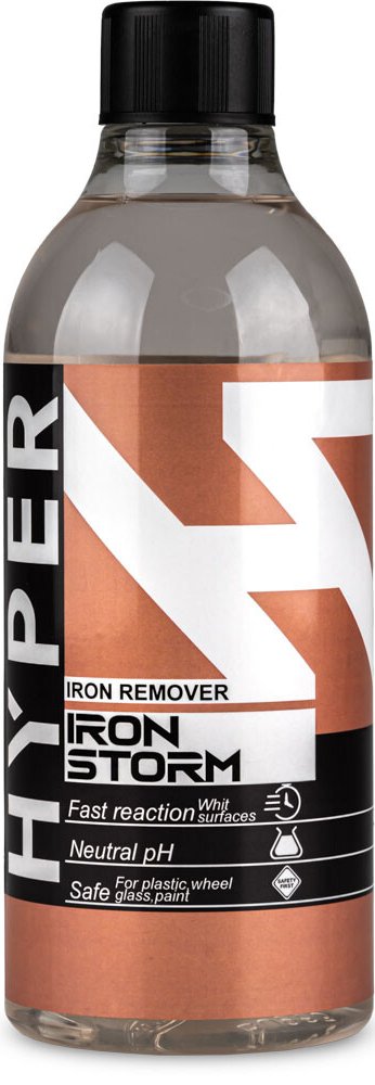 Hyper Iron Storm Iron Remover - přípravek na odstranění poletavé rzi, připravený k použití. Neutrální pH přípravku odstraňuje kovové nečistoty z laku, skla, plastů, ráfků. Pokročilé složení okamžitě reaguje s kovovými usazeninami a rozpouští je do charakteristické fialové barvy. Povrchově aktivní látky obsažené v kompozici usnadňují opláchnutí produktu vodou. Jako jeden z mála nemá nepříjemný zápa...
