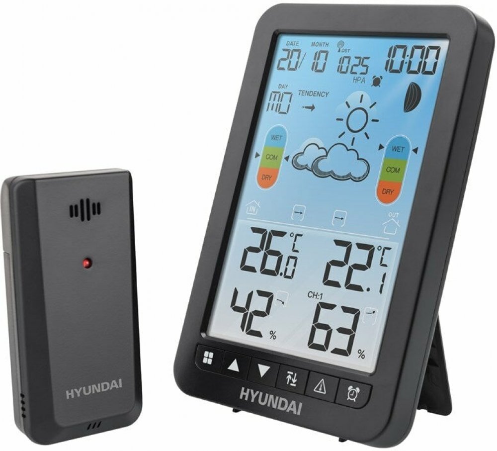 Meteostanice • barevný displej • aktuální čas a datum • čas řízen rádiovým signálem DCF 77 • budík • vnitřní/vnější teplota a vlhkost • předpověď počasí na nadcházející hodiny • nastavení upozornění vnitřní a venkovní teploty/vlhkosti • barometrický tlak • fáze měsíce • kalendář • možnost bezdrátového příjmu venkovní teploty až ze 3 čidel • napájení hlavní jednotky: 3× AAA baterie, napájení senzoru: 2× AAA baterie (nejsou součástí balení)