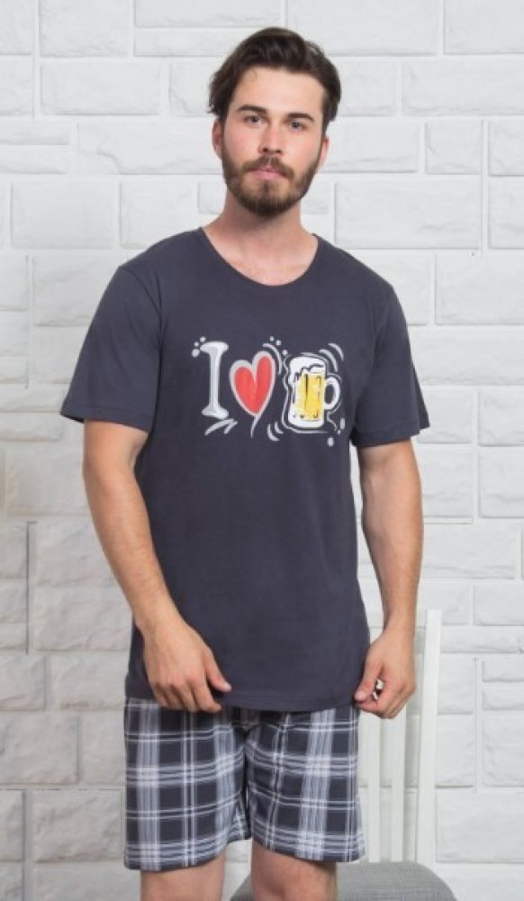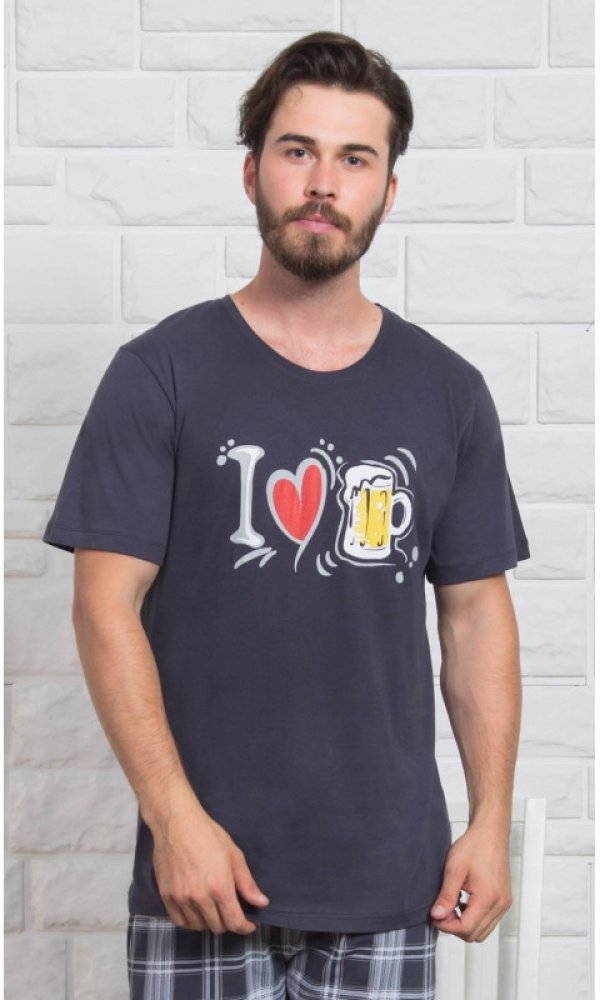 Pánské pyžamo šortky I love beer. Pyžamo se skládá z trička s krátkým rukávem a krátkých šortkových kalhot. Na tričku je obrázek skládající se z nápisu I, srdíčka a půllitru piva, které dávají dohromady větu I love Beer. Krátké šortky jsou kostkované. Použitý materiál je jemný a poddajný na dotek. Pyžamo je vhodné i na denní nošení.
