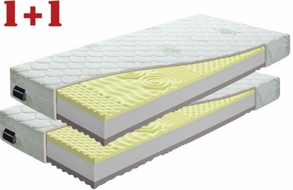 Matrace Artuš 1+1 Doprava ZDARMA. Partnerská sendvičová matrace Artuš v setu 1 + 1 z VISCO elastické pěny (paměťová, líná) se 7 anatomickými zónami v kombinaci s jádrem PUR pěny. Díky paměťovému efektu Visco pěny, která reaguje na teplo a tlak, se optimálně přizpůsobí křivkám vašeho těla. Dochází tak k uvolnění svalů a kloubů.Matrace je vhodná na oboustrannému použití. Povrch je profilovaný a obou...
