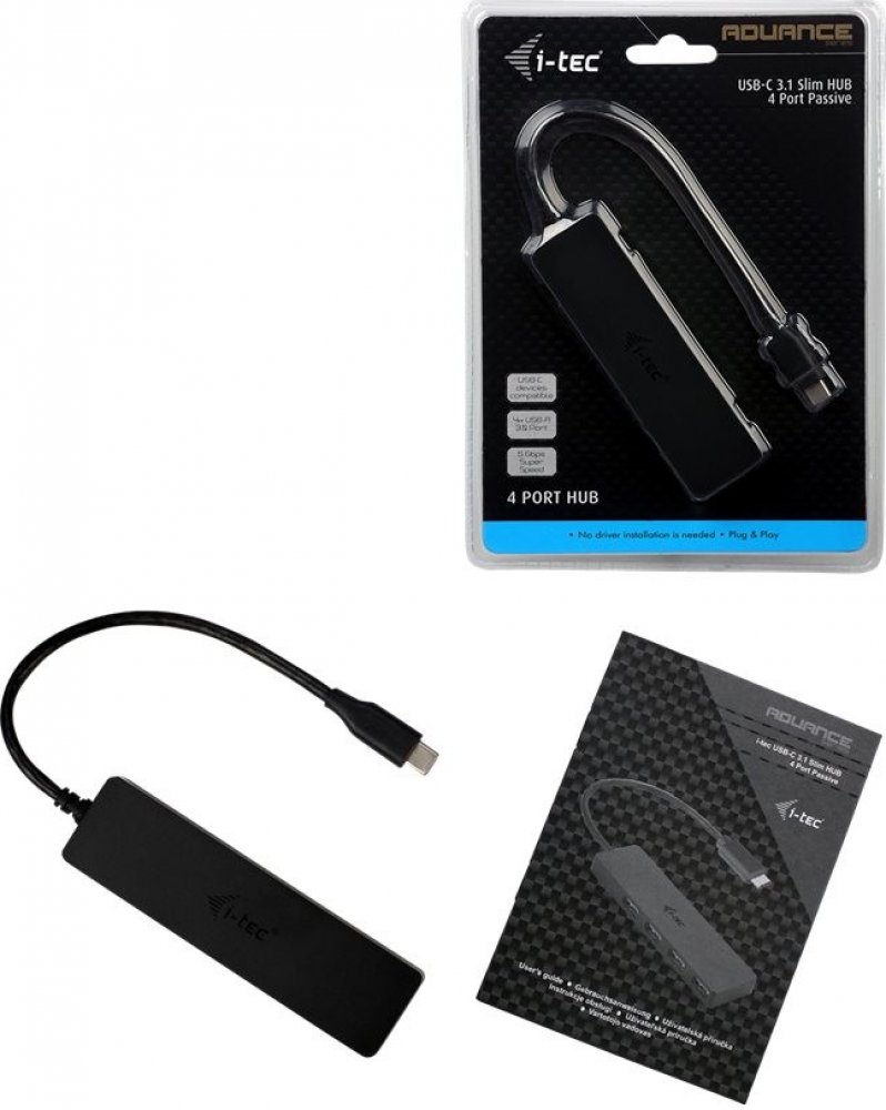 • i-tec USB-C 3.1 Slim HUB 4 Port s integrovaným USB-C kabelem (20 cm)
