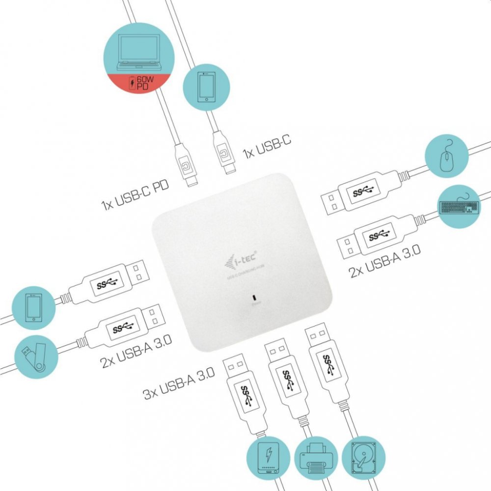 S tímto hubem získáte dalších 7 USB 3.0 portů (až 5 Gbps). Připojte si externí klávesnici a myš, přenášejte data nebo filmy z USB flash disku rychlostí až 5 Gbps nebo nabíjejte svá mobilní zařízení nabíjejte, až rychlostí 7.5W.