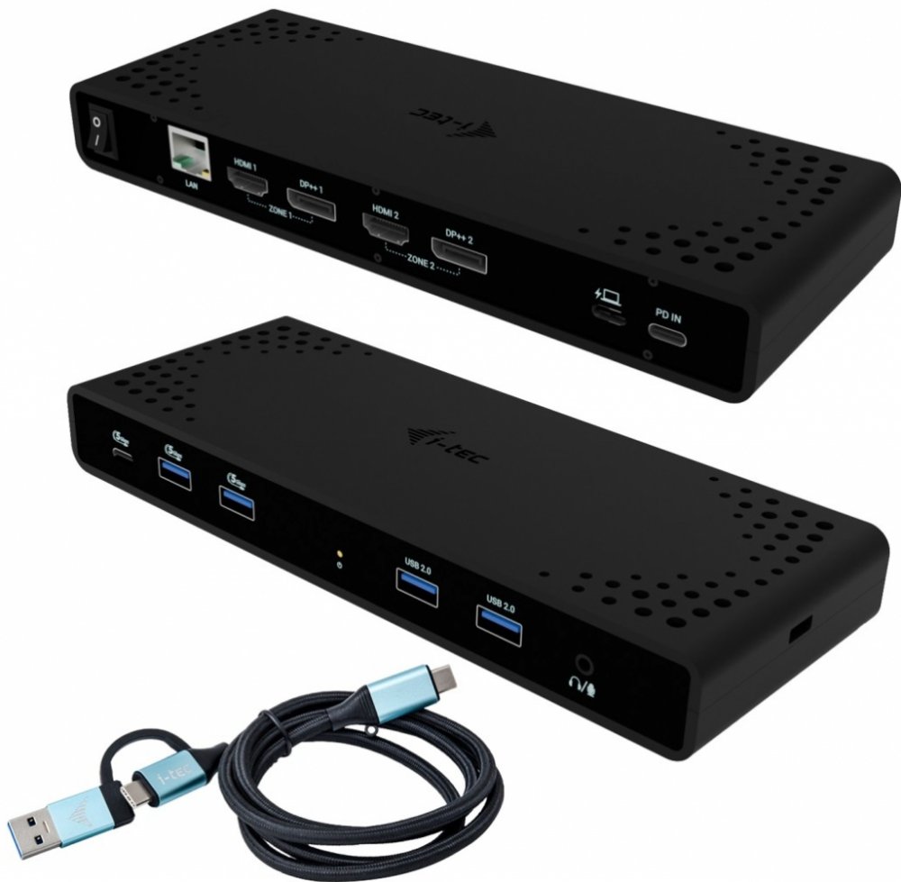 Univerzální dokovací stanice pro notebooky a tablety s USB-C, USB-A, USB4 a Thunderbolt rozhraním. Displejové porty