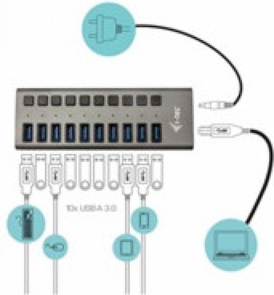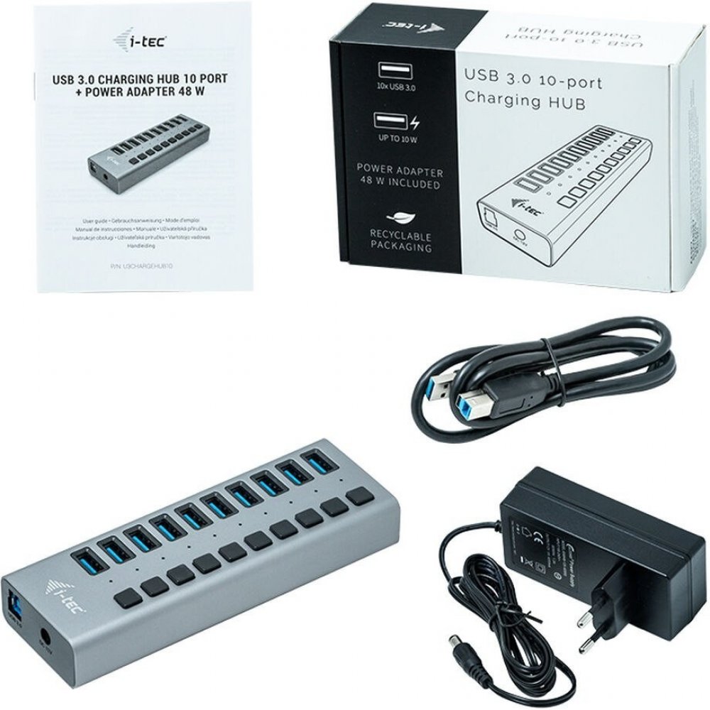 Tento HUB nabízí 10 USB 3.0 portů s funkcí Plug & Play a standardním USB nabíjením – HUB automaticky detekuje, jestli je připojeno zařízení pro USB nabíjení. Díky tomu, že HUB má 10 USB 3.0 portů, je možno nabíjet až 10 zařízení najednou. Rozhraní USB 3.0 je důležité zejména pro datové přenosy z USB 3.0 paměťových karet a flash disků, kde se nejvíce využije jeho vysoká přenosová rychlost. K balení je přiložen externí napájecí adaptér, bez kterého se HUB neobejde. Napájecí adaptér vám zaručí stabilní nabíjení z USB portů a výkon HUBu, poskytující nabíjecí výkon až 10 W na jeden port.