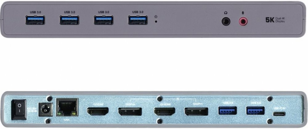 - Grafické rozhraní: 2x HDMI a 2x Display Port. Dokovací stanice podporuje připojení max. dvou monitorů. - Rozlišení: 1monitor připojený přes 2 DP kabely: 1x DP + 1x DP podporuje až 5K 5120x2880@60Hz, grafická karta ve vašem počítači musí podporovat 5K rozlišení, 2 monitory připojeny zároveň: 1x DP + 1x DP podporuje až 4K 4096x2160@60Hz, 1x DP + 1x HDMI podporuje až 4K 4096x2160@60Hz, 1x HDMI + 1x HDMI podporuje až 4K 4096x2160@60Hz