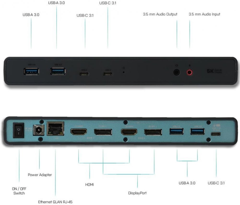 Dokovací stanice dále nabízí audio vstup / výstup, gigabitovou síťovou kartu, šest USB 3.0 portů, Kensington Lock a vypínač ON/OFF. Kromě toho se vyznačuje kompaktním a elegantním designem a vysoce efektivním pasivním systémem chlazení.