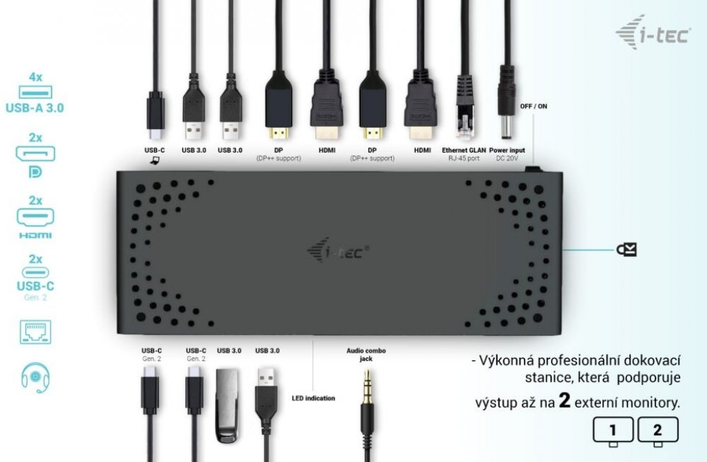 Dokovací stanice vhodná pro grafiky pracující s 5K rozlišením. K počítači či notebooku se připojuje pomocí USB-C portu s podporou Thunderbolt 3 a je tak schopná na podporovaných zařízeních přenášet i napájení 100 W. Kromě možnosti připojit jeden 5K monitor nabízí i volbu zapojit dva 4K monitory s frekvencí 60 Hz. To vše v různých kombinacích konektorů HDMI a...