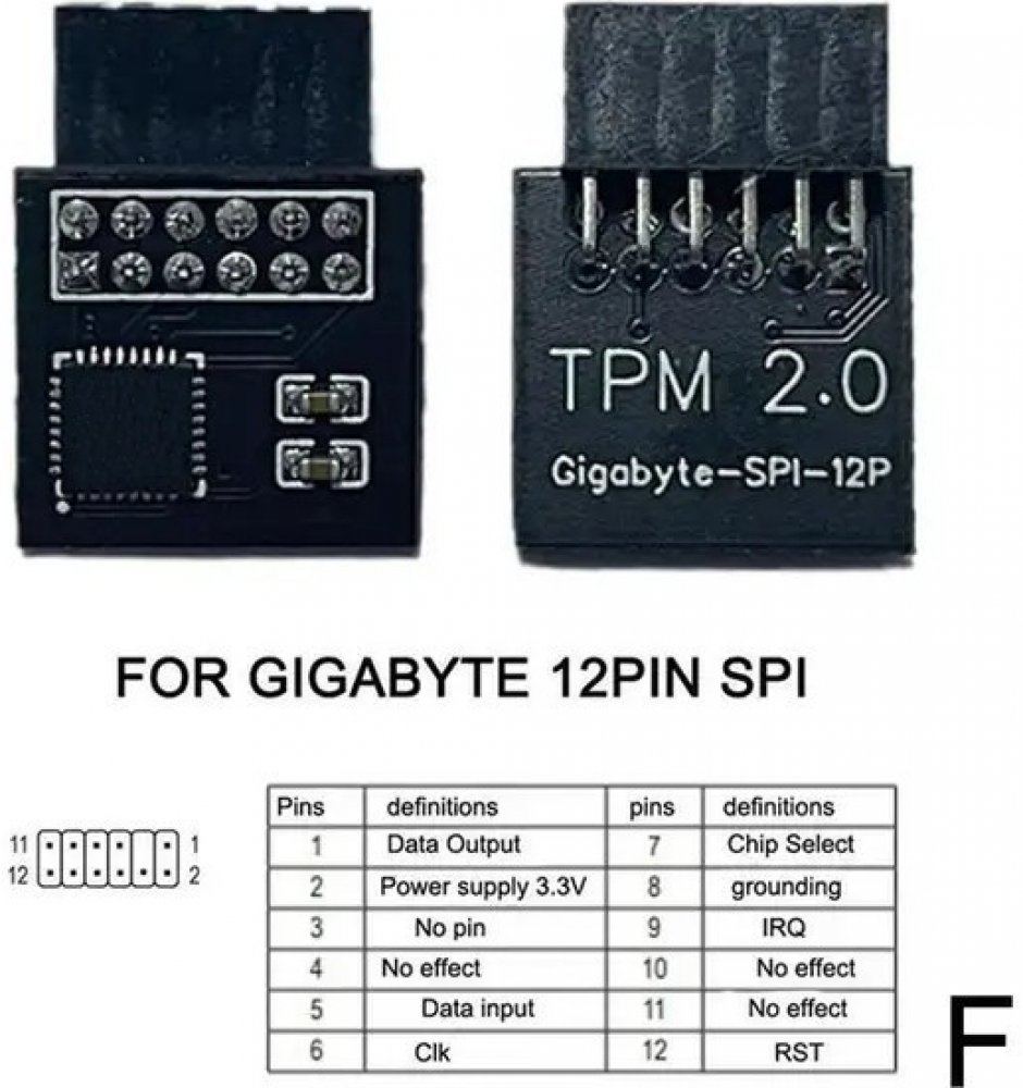 GIGABYTE F-modul TPM 2.0 var:SPI pin:12pin pro Win11. S končící podporou Win-10 a přechodem na Win-11 musí vaše základní deska podporovat kryptovací systém TPM 2.0 a vyšší. Pokud Vaše základní deska nemá integrován kryptovací čip, pomocí tohoto modulu kryptovací čip osadíte. Nezbytná je podpora základní desky na úrovni BIOSU a potřebný typ a konektor který musíte vhodně zvolit podle Vaší základní desky.