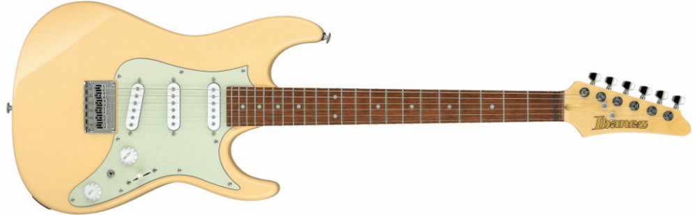 Elektrická kytara Elektrické kytary japonské značky Ibanez z řady AZES (nebo také AZ Essentials) si berou tón, všestrannost a skvělé herní vlastnosti nástrojů ze série AZ a díky dostupnější ceně je nabízí širšímu spektru muzikantů. Tyto nástroje mají ovšem i svá vlastní specifika – menzuru 635 mm, výstupní jack mono-unit z jednoho kusu nebo ocelová sedla (comfort round), která umožňují nastavení výšky strun ve větším rozsahu. Tělo modelu AZES31 Ivory je zhotoveno z topolu. K javorovému krku je přilepen hmatník ze dřeva jatoba osazený dvaadvaceti pražci velikosti Medium. Orientaci na hmatníku usnadňují poziční tečky. Tři pasivní single-coil snímače Essentials s keramickými magnety poskytují kytaře vyvážený tón a zvukovou všestrannost – nástroj tak nalezne uplatnění v široké škále hudebních stylů. Systém přepínání snímačů dyna-MIX 8 (pětipolohový blade switch a dvoupolohový alter switch) nabízí osm různých konfigurací snímačů včetně jejich sériového zapojení. Struny jsou ukotveny ve firemních die-cast mechanikách (split-shaft) a přes pevnou kobylku skrze tělo kytary. Stylový vzhled podtrhuje praktický pickguard a chromovaný hardware. Kytary s označením Standard jsou základní řadou značky Ibanez. Jedná se o cenově dostupné nástroje, které kvalitním zpracováním, zvukem a herními vlastnostmi osloví začínající i zkušené hráče.