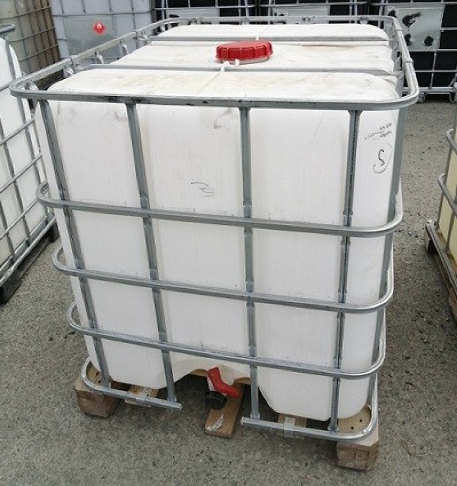 Kód produktu: 55201002. Repasovaný IBC kontejner vhodný např. na závlahovou vodu. Nádrže o objemu 1000 litrů využitelné například pro závlahovou (dešťovou) vodu. Jsou vyčištěny na naší speciální lince, zachycená užitková voda nebude kontaminována původním obsahem. Vnitřní plastová nádoba je vymytá, vysušená, těsná s funkčním výpustním ventilem. Uvnitř vnitřní nádoby mohou být patrné změny povrchu způsobené původní látkou. Ocelová konstrukce včetně mix palety (dřevo, ocel, plast) je funkční, ale může být lehce poškozena. - Foto je ilustrační -