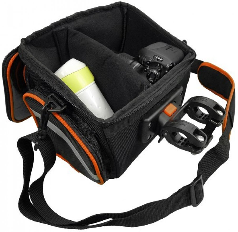 Hlavní polstrovaná kapsa, dvě boční a jedna přední kapsa, horní průhledné pouzdro na mapu, popruh přez rameno. Brašna je opatřena reflexními prvky. Součástí balení je: Ramenní popruh, nastavitelný držák.
