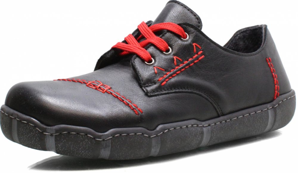 Dámské polobotyky Mago na bytelné podešvi s protiskluzovým vzorem. Kombinace černého vzoru s červenými doplňky dává botám šmrnc.