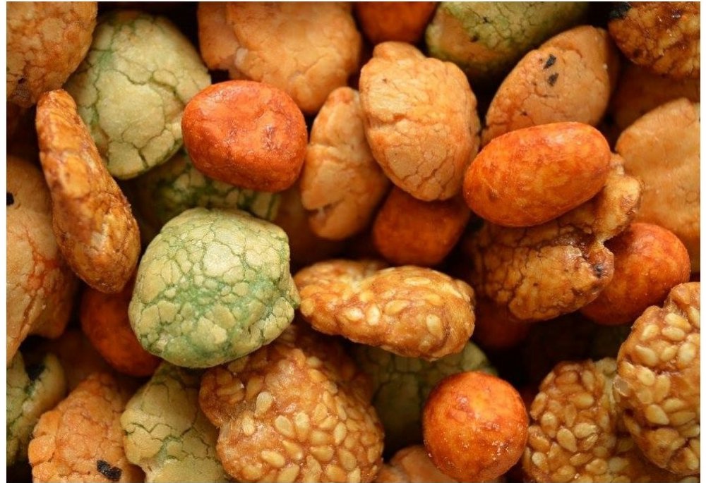 Arašídy 25.6%. pšeničná mouka (lepek) 24%. modifikovaný kukuřičný škrob, cukr, kukuřičná mouka sezam, bramborový škrob, palmový olej, sůl, dextrin, cibule, česnek, sójová omáčka, mořská řasa E500, E160c, E503, E150d, E330, E163, E141i.