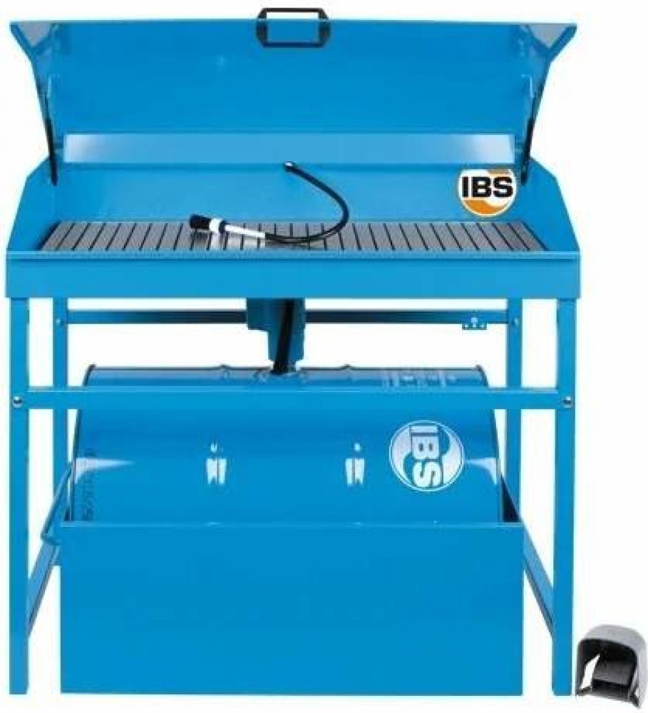 Mycí stůl pro čištění dílů, s elektrickým čerpadlem ovládaným pedálem a průtokovým štětcem, s víkem, nosnost 0,25 tuny, pro max. 200litrový sud – IBS Scherer 2120301