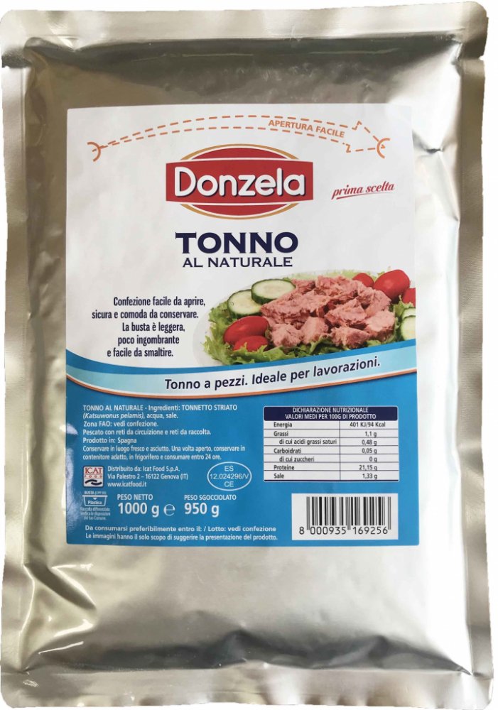MINIMÁLNÍ TRVANLIVOST DO: 21.3.2026 Kousky tuňáka v přírodním nálevu 1000g Složení: Kousky z TUŇÁKA (Katsuwonus pelamis), voda, sůl. Výživové údaje ve 100 g výrobku: energie 401kJ/94 kcal, tuky 1,1g, z toho nasycené mastné kyseliny 0,48 g, sacharidy 0,05g, z toho cukry 0g, bílkoviny 21,15 g, sůl 1,33 g Obsah: 1000g e. Pevný obsah: 950g. Minimální trvanlivost do: uvedena na obalu. Uchovejte na chladném a suchém místě. Po otevření přelijte do vhodnější nádoby a nechejte v původním nálevu