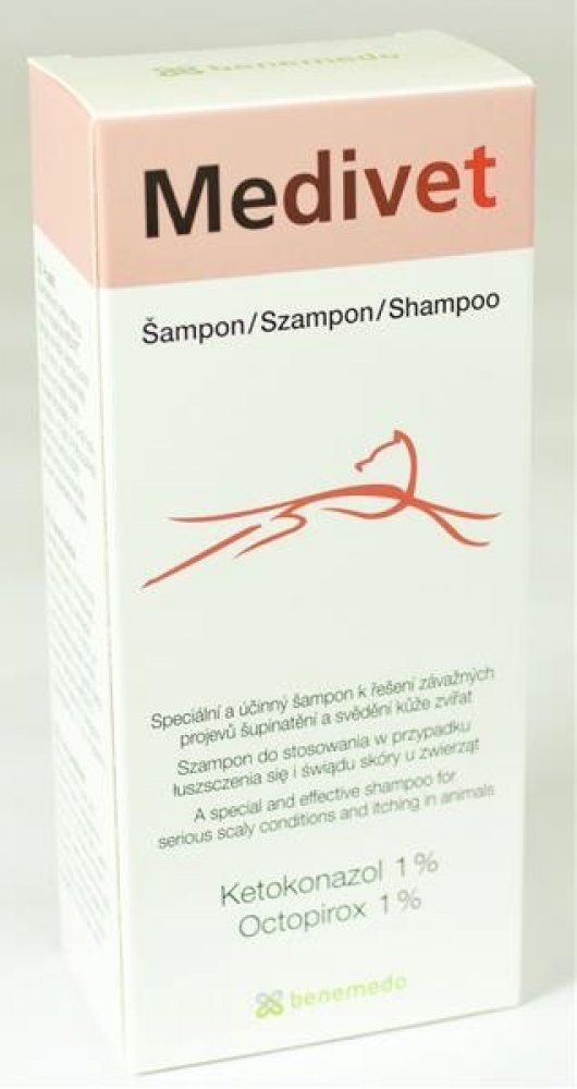 Speciální a účinný šampon k řešení závažných projevů šupinatění a svědění kůže zvířat. Medivet je účinný v péči o problémovou kůži a srst psů, koček, koní a dalších zvířat. Složení: Ketokonazol, Octopirox Podání a dávkování: Navlhčete srst zvířete vlažnou vodou. Vmasírujte Medivet šampon do kůže. Nechte působit 10-15 minut, poté opláchněte vodou a srst dobře osušte. Koupání provádějte 2 - 3 krát týdně po dobu 4 - 6 týdnů.
