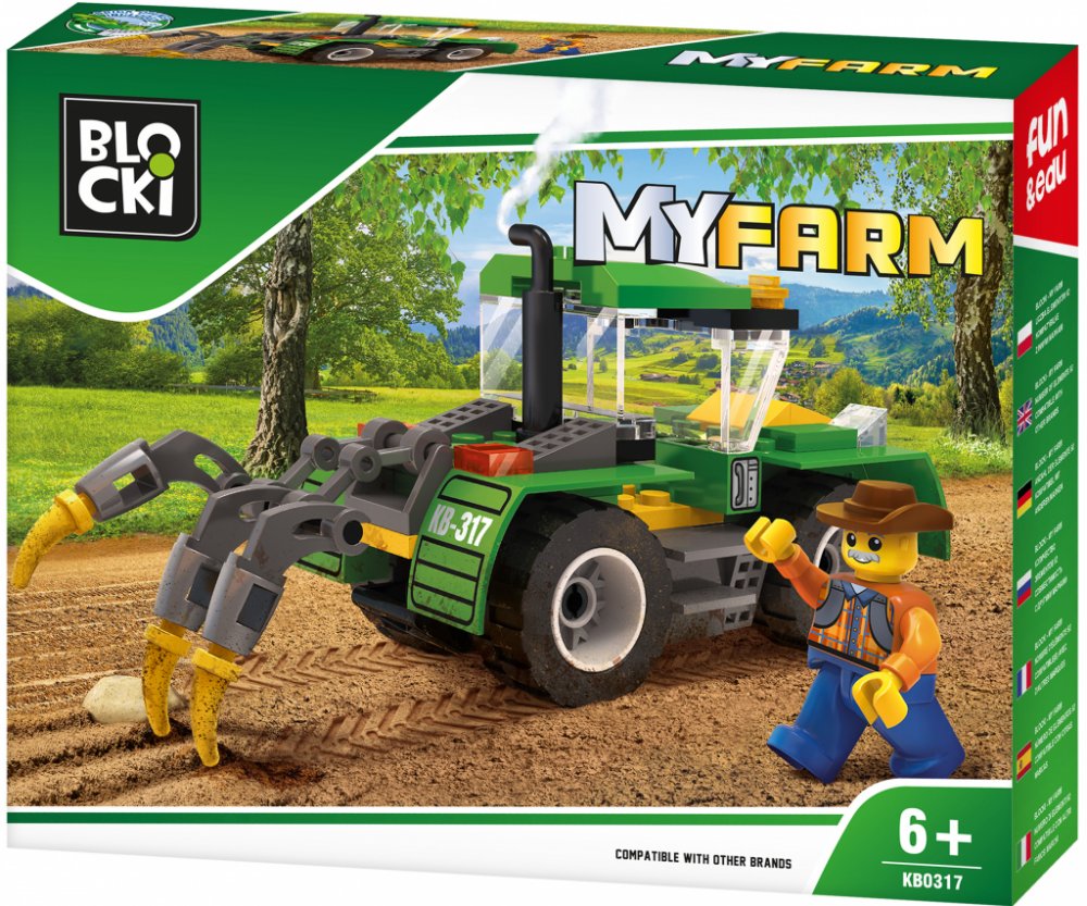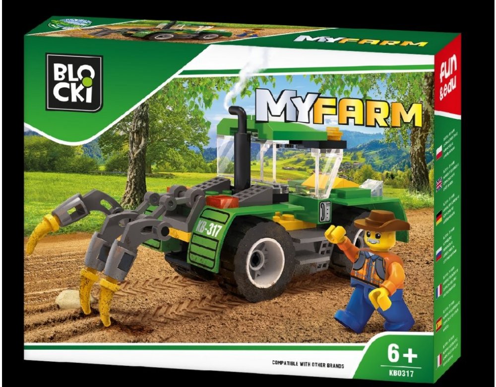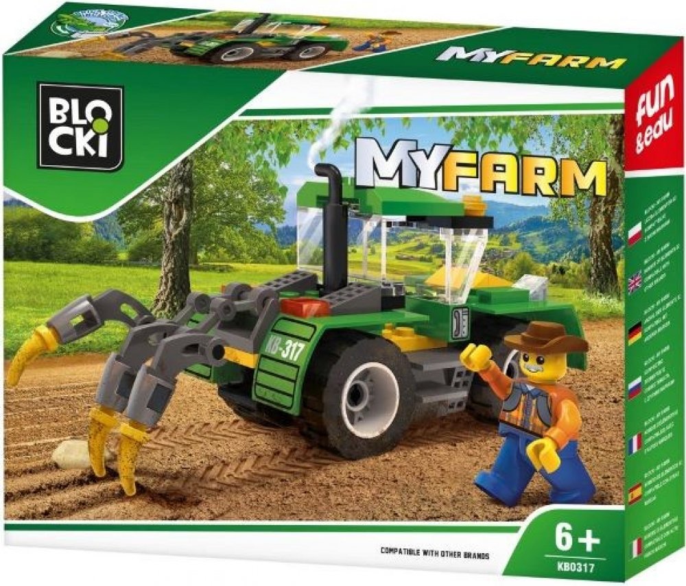 Stavebnice zemědělského stroje - traktoru (LEGO kompatibilní). Traktor s příslušenstvím a figurka farmáře. Baleno v kvalitním kartonovém obalu s barevným potiskem, návod na sestavení součástí balení. Oddělovač kostiček součástí balení. Plně kompatibilní s dalšími stavebnicemi (LEGO, Sluban apod.). Rozměry balení (kartonového obalu) cca. 20x16x4cm. Certifikace CE, EN71-3. 85 dílků. Sestavte si velkou farmu se všemi sadami Blocki MyFarm! Stavebnice BLOCKI pomáhají dětem rozvíjet kreativitu a představivost, učí je řešit problémy, trénují manuální schopnosti a jemnou motoriku. Lehce se skládají, jsou dodávány v estetických obalech, mají evropský atest i certifikaci. Jsou plně kompatibilní se všemi ostatními známými značkami stavebnic jako je LEGO, Sluban a další. Pro nejmenší děti nabízíme řadu MUBI, kompatibilní s např. LEGO Duplo, pro dívky je zde řada LALILANDIA.