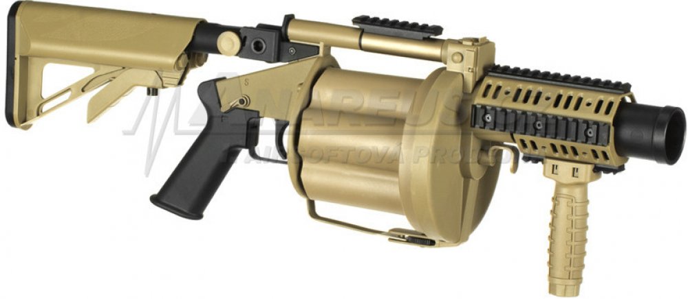 Tento víceranný granátomet je velice lehký a má bubnový zásobník na 6 airsoftových granátů 40mm.